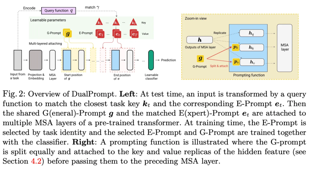 이제 DualPrompt에 대해 살펴보도록 하겠습니다. DualPrompt overview는 위 그림2와 같습니다. 모델은 ViT를 사용하게 되구요, 앞에서 말한 것처럼 DualPrompt는 General prompt인 G-Prompt와 Expert Prompt인 E Prompt로 구성이 되어 있습니다. 그림에서 노란색 g가 general prompt인 G-prompt, 빨간색 네모가 expert prompt인 E-Prompt이며 세모들이 각 e-prompt와 쌍을 갖는 key에 해당합니다.