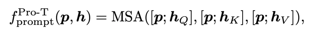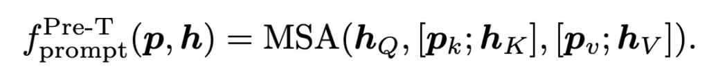 각각에 대해 간략 설명드리자면 아래 식과 같이 prompt tuning은 transformer의 query key value에 해당하는 모든 부분에 prompt가 concat되어 붙어져 들어가는 구조이구요. Prefix-Tuning은 key와 value에만 반영이 돼서 hidden representation과 함께 학습되는 방법입니다.