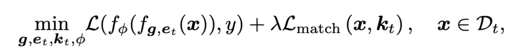 전체적인 object function은 다음과 같은데, 기존 cross entropy loss로 classifier head와 prompt를 업데이트 하는 구조이고, 추가적으로 앞서 언급했던 key matching loss로 query로 들어간 값과, 각각의 task마다 e-prompt가 pair로 구성되어 있다고 했었는데, 해당 task의 key와 값이 가까워지도록 가까워지도록 matching loss를 구성해 사용하고 있습니다.