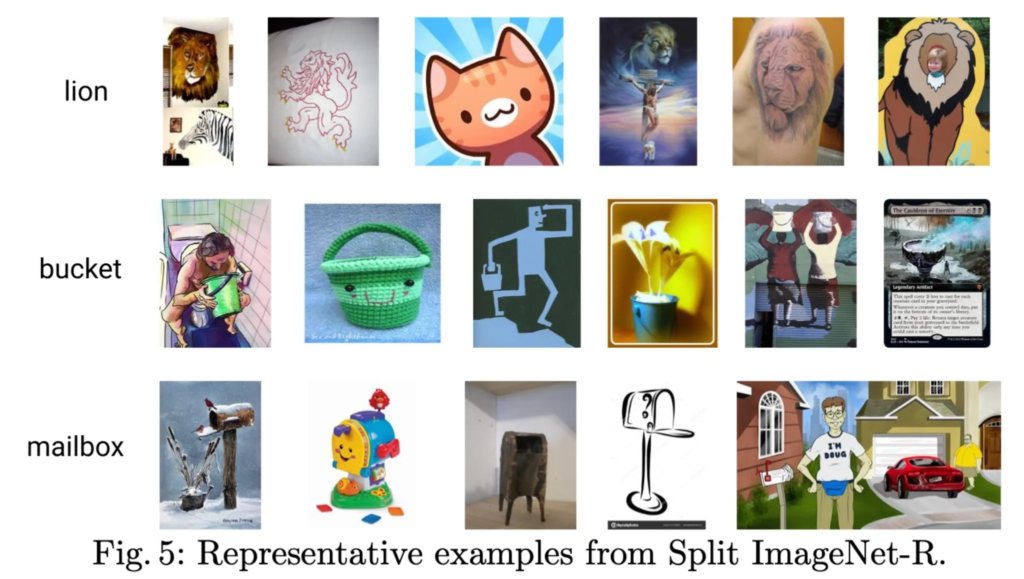 위 그림이 ImageNet-R 예시인데, 이 ImageNet-R은 그냥 ImageNet과는 다르게 같은 class여도 굉장히 다양한 스타일을 갖고 있습니다. 맨 윗 행에 사자 class에 대한 사람들을 봐도 실제 사자 그림이나 카툰 형태 등등의 다양한 스타일 그림을 볼 수 있습니다. 그래서 기존 standard model 예를 들어 resnet이나 어떤 cnn 기반 모델로는 학습하기 어려운 데이터셋이라고 보시면 됩니다. 그래서 좀 더 continual learning할 때 buffer를 이용하게 되면 이 이전 task의 buffer를 저장했더라도 syle이 다르기 때문에 리허설 버퍼를 사용하기 좀 까다로운 데이터셋이라고 보시면 되겠습니다. 그리고 또 split CIFAR-100을 사용했는데 기존 cifar100을 10개의 task로 나눈 데이터셋입니다.