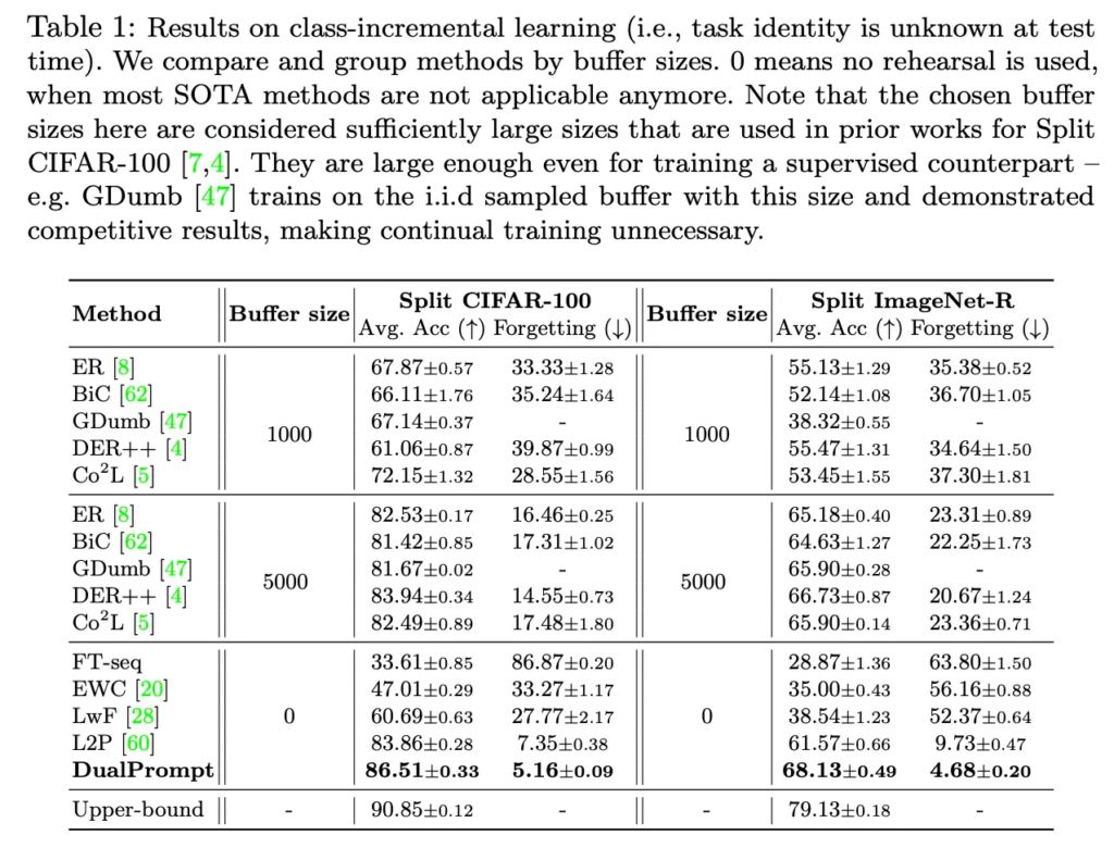 기존 sota와 비교한 결과는 다음과 같습니다. 이 표는 기존 리허설 based 방법론도 같이 비교를 한 table인데, 보시면 buffer size가 1000일때보다 5000일때, 즉 클수록 성능이 높은 것을 확인할 수 있구요. Buffer size가 0인 부분 중에서 Prompt를 사용하는 방법론으로는 L2P와 dualprompt가 있는데 dualprompt 성능이 리허설 버퍼를 사용하지 않았음에도 성능이 잘 나온 것을 볼 수 있고, 기존 L2P보다 높은 정확도, 낮은 forgetting을 보이고 있습니다. 여기 리허설을 사용하지 않는 다른 방법론들은 Ft-seq나 EWC, LwF 방법론들은 regularization 방법인데, 이건 비교적 성능이 많이 낮은 것을 볼 수 있습니다.