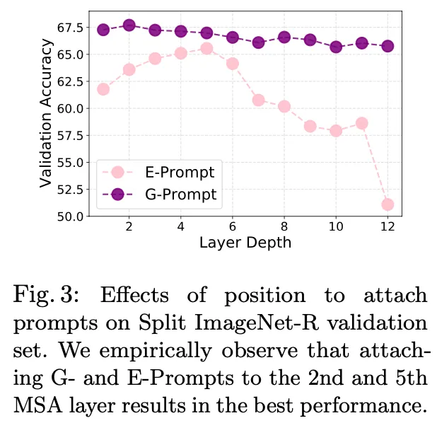 먼저 어디에 붙여야 하는지에 대해서는, 직관적으로 transformer 백본의 서로 다른 layer가 모두 다른 feature level을 갖고 있을 것이구요. Task간의 공통적인 정보는 shallow한 layer에서, task specific한 정보는 좀 더 deep한 layer에서 잘 표현될 수 있을 것입니다. 이런 점을 바탕으로 G-Prompt와 E-Prompt를 서로 독립적인 위치에 붙일 수 있도록 서례를 했으며 각각의 최적 position을 실험을 통해 찾고자 했습니다. 이에 대해서는 실험 부분에서 마저 살펴보도록 하겠습니다.