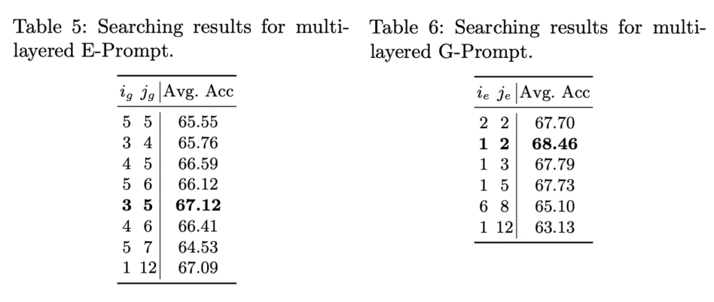 그리고 이건 여러 layer에 prompt를 붙였을 때인데, E-prompt는 3번째부터 5번째 3, 4, 5 layer에 붙였을 때. 그리고 G-Prompt는 첫번째 두번째에 붙였을 때 가장 좋았습니다. 이건 기존 딥러닝 모델도 layer가 깊어질수록 세부적인 feature를 capture하는데 그런 것과 일맥상통한 결과라고 볼 수 있겠는데요. Task-specific한 prompt가 비교적 뒤에 붙였을 때 좋았고, general prompt는 앞쪽에 붙이면 좋았다는 결과로 정리할 수 있습니다.