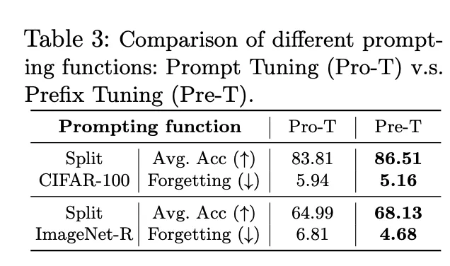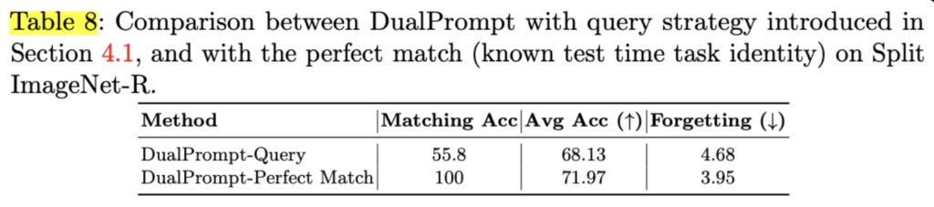 위 Table8은 DualPrompt의 query 기반으로 e-prompt를 선택하는 방식을 사용한 것과 100% perfect하게 매칭하도록 하여 이에 대한 acc, forgetting을 비교한 실험입니다. 보시면 사실 query 기반으로 E-Prompt를 선택하는 경우 matching 정확도는 55.8 정도밖에 안되는데요. 그럼에도, 전체 평균 정확도는 68.13%로 100% 매칭된 경우와 약 3~4% 정도 차이밖에 보이지 않습니다. 이에 대해서 저자들은 E-Prompt가 좀 noisy한 경우에도 G-Prompt의 task-invariant한 guidance가 어느정도 상쇄해준다고 하며, cosine similarity 기반의 query matching이 매칭 정확도가 높지는 않지만, task간의 유사도를 어느 정도 반영하기 때문에 완전 엉뚱한 task를 선택하는 경우는 적다는 가정을 두고 있습니다.