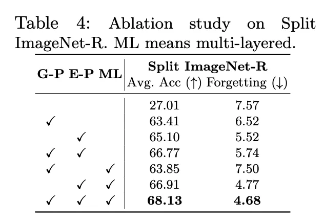 다음은 ablation study로 G-Prompt와 E-Prompt사용 여부 여러 layer에 붙였을 때 여부입니다. 이 ML이 없는 경우는 앞서 하나만 붙였을때의 결과고, ML을 붙였을 때는 multi layer에 prompt를 붙였을때의 결과입니다. 가장 좋았을 때는 G-Prompt, E-Prompt를 쓰고 이걸 multi-layer에 붙였을 때 가장 높은 acc, 가장 낮은 forgetting 수치를 보이고 있습니다.