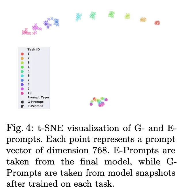 이건 G-Prompt와 E-Prompt를 t-SNE를 통해 visualization한 결과입니다. 보시면 G-Prompt는 한 곳에 뭉쳐있는 것을 볼 수 있고, E-Prompt는 task-specific하게 각각 따로 따로 뭉쳐있는 결과를 확인할 수 있습니다. 따라서 본 논문이 주장하는 대로, G-Prompt는 좀 더 general한 knowledge가 잘 학습이 됐고, E-Prompt는 좀 task-specific한 knowledge가 잘 학습됐다는 것을 확인할 수 있습니다.