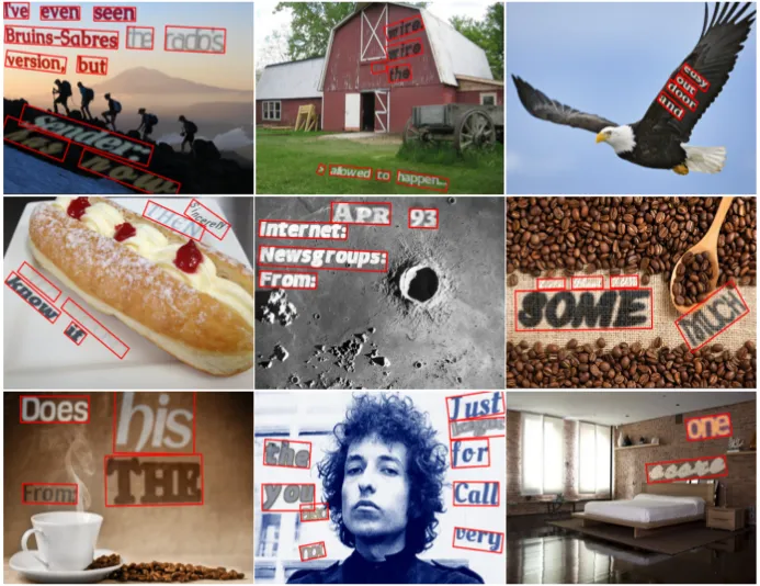다른 도메인의 테스크에서도 그렇듯 Text recognition task도 데이터셋 라벨링으로부터 자유롭지 않습니다. Recognition을 수행하는 모델을 학습시키기 위해서는 이미지에서 각 텍스트 마다 주석이 필요한데요 이는 아주 고비용의 작업입니다. 이런 데이터 부족 문제를 해결하기 위해 이전 연구들은 합성된 이미지를 사용했습니다. 합성 데이터란 텍스트가 없던 이미지 위에 텍스트를 붙여 합성된 이미지를 가리킵니다. 아래는 대표적인 합성 데이터셋 SynthText의 사진 일부입니다. 보시면 다른 scene text data와는 조금 어색함을 느낄 수 있습니다.
