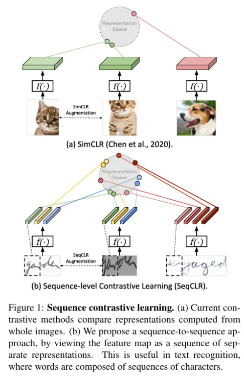 이렇게 더 많은 양의 데이터를 확보할 수 있었지만 real data와 이런 synthetic data간의 gap으로 text recognition 모델의 성능을 개선하는데에는 한계가 있었다고 합니다. 데이터셋이 부족하고 라벨링이 어려운 분야의 task에 대한 모델을 학습하는데 자기 지도 학습 방식을 사용하는 것이 보편화 돼있었습다. Text recognition 태스크에 자기 지도 학습을 적용한 게 이 논문이 처음은 아니었는데요 특히 자기지도 학습 방법으로 contrastive learning을 사용한 여러 연구는 존재했었습니다. 대표적인 연구로는 SeqCLR, PerSec이 있습니다. 기존 이미지 분야에서 contrastive learning을 적용한 연구들은 대부분 이미지 하나에 대한 벡터를 임베딩 공간에 나타내고 이미지 간의 유사도를 학습한 반면 SeqCLR은 텍스트 데이터 특성 상 연속성을 갖는 sub-word level의 sequence로 나눠 이를 각각 임베딩한 후 유사도를 학습시킨다는 게 다릅니다. 아래는 SeqCLR 논문의 figure로 그 두 도메인에서의 대조학습 적용방식이 다름을 확인할 수 있습니다.