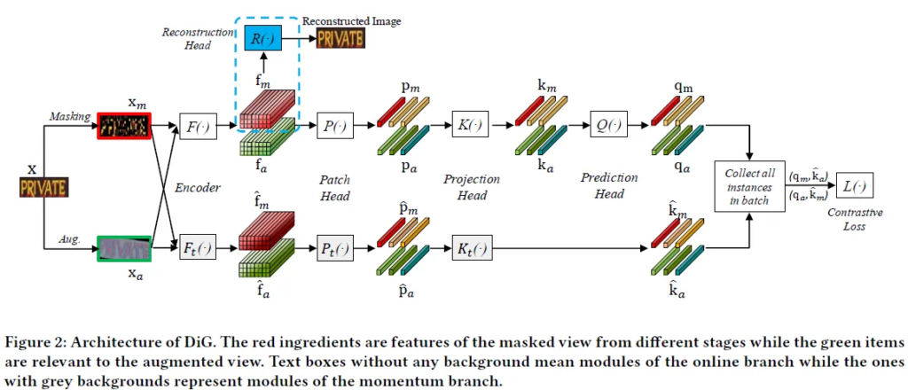 위 구조도에 보이는 대로 이미지에서 텍스트 부분만을 crop한 패치단위의 이미지를 입력으로 받습니다. recognition task는 일반 text detection이나 text spotting task에서와는 다르게 오직 하나의 텍스트 인스턴스만 나와있는 패치화된 이미지를 학습 데이터로 받습니다. 입력된 이미지는 크기가 조정이 되고요. 입력된 이미지를 마스킹하고 증강을 따로 적용한 두개의 이미지를 인코더의 F(\cdot ) 입력으로 들어갑니다. DiG 아키텍쳐는 위와 같은데 크게 총 3개의 브랜치로 나눌 수 있습니다. 인코더를 타고 나와 마스킹된 이미지로 부터 추출된 f_m을 reconstruction head에 통과시켜 원래 이미지로 재구성하는 과정을 r거치게 되는데 이를 masking image modeling 브랜치라고 하고 모델이 generative representation 학습하도록 유도하는 부분입니다. 인코더로 부터 마스킹된 이미지와 증강이 적용된 이미지 각각 에 대해 얻은 f_m, f_a를 차례대로 Patch Head, Projection head, Prediction head에 통과시켜 contrastive learning의 쿼리 q_m, q_a를 얻는 전 과정은 contrastive learning 브랜치입니다. 여기서 추가로 momentum branch를 두어 contrastive learning 시 필요한 \hat{k}_m, \hat{k}_a를 얻습니다.q_m은 \hat{k}_a와 그리고 q_a은 \hat{k}_m과 하나의 positive 쌍을 이뤄 contrastive learning이 이뤄집니다. 같은 배치내의 다른 이미지하고는 negative 쌍을 이루게 됩니다.