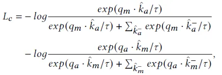 마이너스가 붙은 값들은 negative sample로 생성된 key들로 같은 배치내의 다른 텍스트 인스턴스에 대한 것입니다. \tau는 temperature로