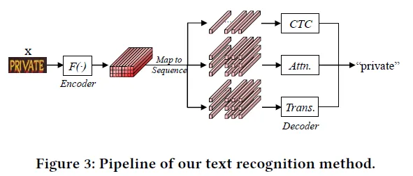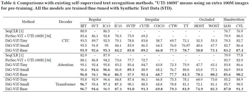 Text recognition은 위 구조로 설계되어 task가 수행됩니다. DiG에서 학습된 ViT를 인코더로 사용합니다. 이후 recognition에 맞게 인코더를 타고 나온 2D feature를 가지고 character sequence를 차례대로 출력할 수 있는 recognition 디코더를 붙입니다. 디코더로는 CTC, Attention decoder, Transformer decoder를 사용할 수 있다고 합니다.