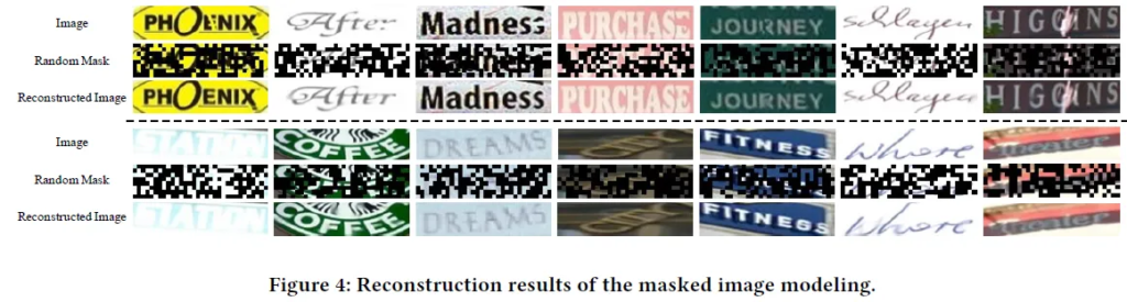 이는 사전학습 시 maked image modeling branch에서 모델이 reconstruct한 정성적인 결과들로 제가 봐도 원본 텍스트를 유추하지 못할 만큼 어지러운 이미지의 마스킹된 부분을 잘 매꿔짐을 확인할 수 있습니다. 위의 정성 결과를 통해 Pre-training 과정 중에 인코더로부터 generative feature에 대한 학습이 잘 이뤄짐을 알 수 있습니다.