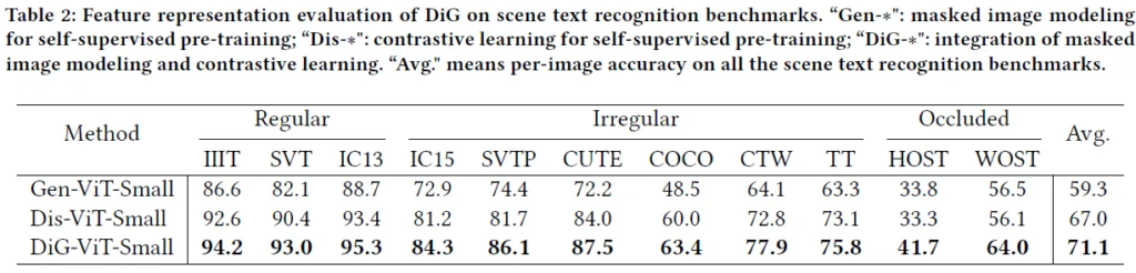 다음 실험은 사전학습을 통해 얼마나 feature representation을 잘 학습했는지를 확인하기 위한 실험으로 인코더를 freeze 시키고 디코더만을 파인튜닝 시킨 후 text recognition task를 수행해 그 결과를 확입합니다. 실험 결과에서 제시된 Gen-ViT-Small, Dis-ViT-Small, DiG-ViT-Small은 각각 contrastive learning, masking image modeling 수행 여부를 달리해 정의한 사전학습 모델로 결과를 보면 정성적인 결과 및 정량적인 결과에서도 두가지 방식을 모두 가지고 사전학습되 DiG-ViT-Small 방법이 제일 정확하고 여러 복잡한 텍스트 이미지들로 구성된 데이터셋에 대해서도 강인한 recognition 결과를 보입니다.