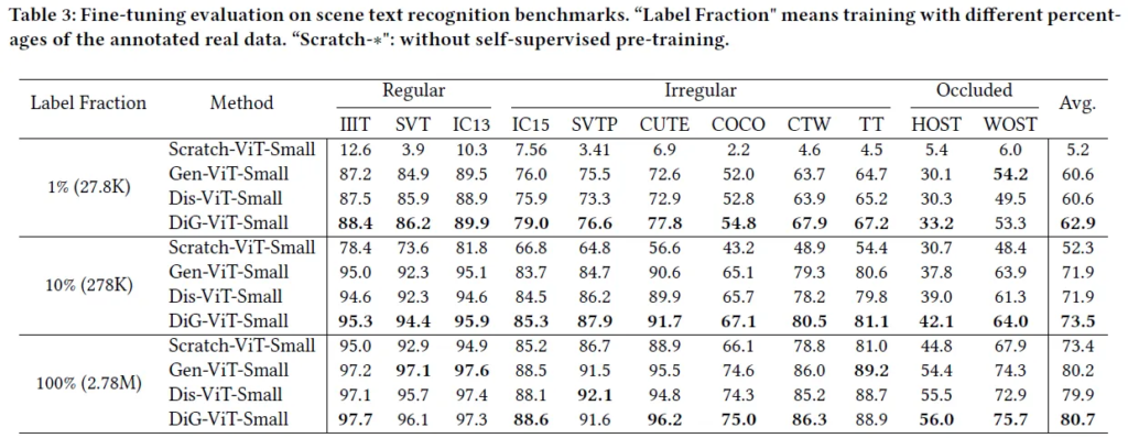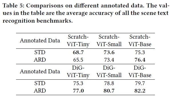 이는 두개의 서로 다른 annotated data에 대한 실험인데 STD는 더 많은 텍스트가 포함된 large scale 데이터셋으로 많은 양의 데이터로 부터 텍스트 자체가 갖는 의미론적인 특징까지 모두 학습할 수 있다는 특징이 있고 ARD는 양은 적지만 STD보다 훨씬 양이 적지만 대신 텍스트의 외형이 다양한 게 특징입니다. 모델의 크기가 작은 경우 ViT-Tiny, ViT-Small등 표현력의 제한으로 저수준의 외형 정보보단 고수준의 semantic 정보가 우선적으로 학습됩니다. 이는 Scratch methods에 대해서 두 데이터셋간의 결과 차이로 인해서도 확인이 되는데요. 비교적 작은 크기의 모델의 경우 STD에서의 결과가 더 높습니다. 이런 반면 DiG는 크기 차이 없이 세개 모두 ARD에서의 결과가 좋습니다. DiG의 supervised learning이 small 모델이 갖던 외형적 정보를 표현한느데의 한계를 극복한 것으로 이해해볼 수 있습니다.