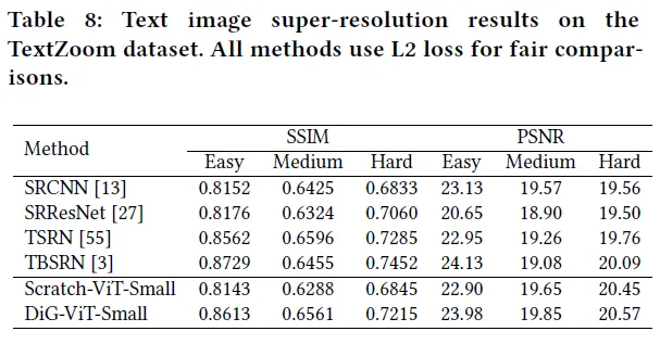 Image super-resolution이라고 텍스트 내용은 그대로 유지하면서 저품질의 이미지를 고해상도의 이미지로 재구성하는 task입니다. DiG의 인코더에 super-resolution decoder가 붙습니다. text segmentation의 디코더와 유사합니다. loss는 L2 loss를 사용합니다.
