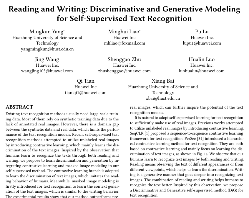 TESTR과 DPText-DETR에 이어서 텍스트 인식 task에 집중하며 논문을 읽고 교육받고 있습니다. 당분간은 이 주제의 논문들을 읽고 리뷰를 작성할 듯 싶습니다. 이번에는 Text Recognition만을 다룬 연구인 DiG 논문을 가져왔습니다. 그리고 이 논문의 주제를 한줄로 정리하자면 Self-supervised learning을 text recognition task에 적용한 연구입니다.