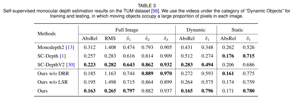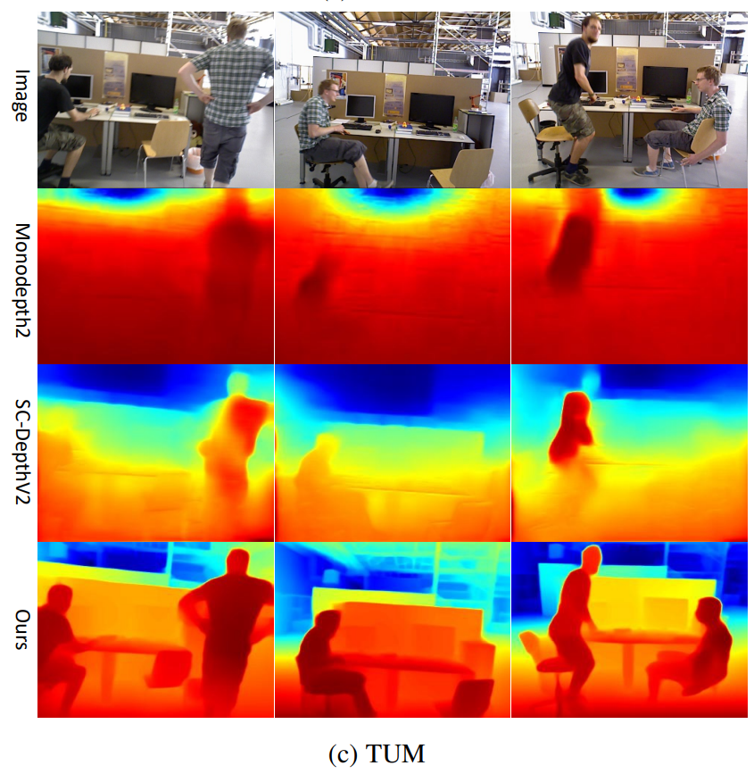 TUM 데이터셋도 BONN 데이터셋과 비슷한 경향성으로 SCDepth-v3가 가장 좋은 성능을 보여줍니다.