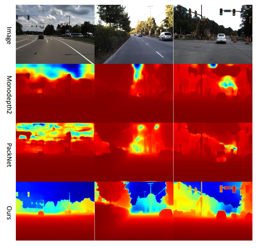 SC-Depth 방법론들이 Dynamic Region을 중점적으로 다루는 방법론들이라고 했습니다. 그래서 Monodepth2, SGDepth과 비교해서 Sc-Depth V1이 상당히 좋은 성능을 보여주는 것을 볼 수 있습니다. PackNet의 경우에는 Monodepth2, SC-Depth 등이 Resnet18을 쓰는 것과 비교해 모델의 크기가 상당히 무거운 (약 300M정도?였던걸로 기억) 모델이기 때문에 RMSE이나 Delta metric에서 좋은 성능을 보이지만 AbsRel과 SqRel에서는 SCDepth보다 많이 떨어지는 것을 볼 수 있습니다.