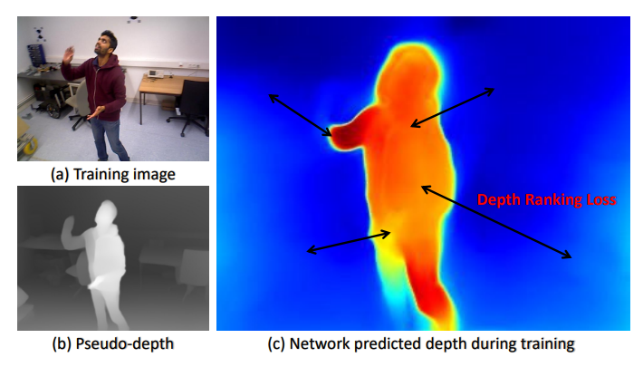 그래서 V3에서는 저자들이 dynamic region에 대해서도 학습을 할 수 있도록 하는 학습 방식을 제안합니다. 우선 대략적인 방법론은 사전에 학습된 depth model을 통해서 뽑은 Pseudo depth map을 통해 각 픽셀들의 거리가 어떤 관계인지 (즉 두 픽셀 a, b에 대해서 a는 b보다 가까운지 먼지)를 계산하도록 한 다음에 그 관계에 따라서 해당 픽셀의 깊이는 비교 대상의 픽셀보다 가깝도록 혹은 멀도록 하는 목적 함수를 적용하는 것입니다.
