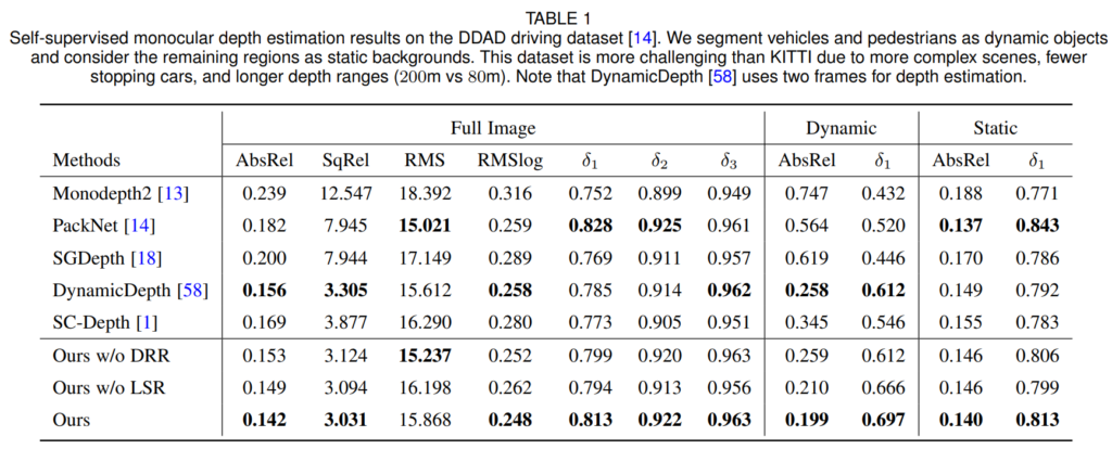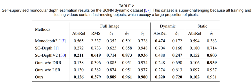 평가에 사용된 데이터셋은 총 5가지로 outdoor 데이터셋 2가지 (DDAD, KITTI) Indoor 데이터셋 3가지(BONN, TUM, NYUv2) 입니다. 이중에서 KITTI와 NYUv2는 정적인 scene 위주로 구성되어있으며, DDAD와 BONN, TUM 데이터셋은 Dynamic Region이 많이 분포된 데이터셋으로 self-sup이 학습하기 더 어려운 데이터셋이라고 생각하시면 됩니다.