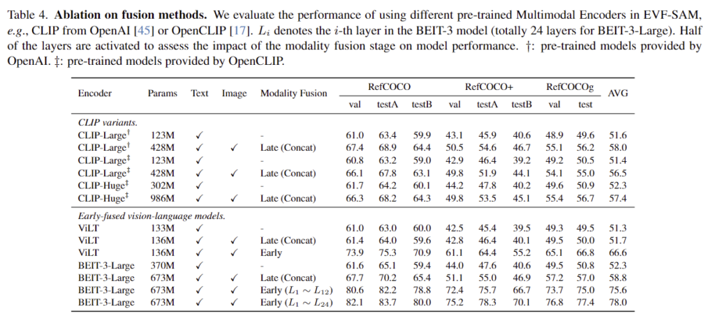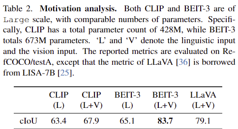 우선 저자들은 multi-modal referring 정보의 중요성을 검토합니다. SAM은 프롬프트에 따라 segmentation 성능이 달라지며, SAM을 기반으로 하는 RES 작업을 수행하기 위해서는 입력 텍스트로부터 대상 영역의 위치 정보를 인식해야 합니다. Table 2는 RefCOCO/testA에 대한 RES 성능 결과를 나타낸 것으로, SAM이 사용한 방식인 CLIP의 text encoder로 text 모달리티만 인코딩한 방식은 위치 정보를 추출할 수 없어 성능이 저조함을 실험적으로 확인하였으며, CLIP과 BEIT-3에서 모두 multi-modal 프롬프트를 사용하는 게 성능이 더 좋다는 것을 확인하였습니다.