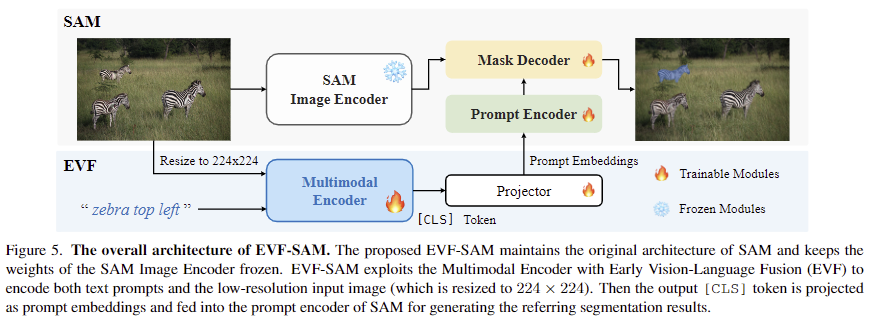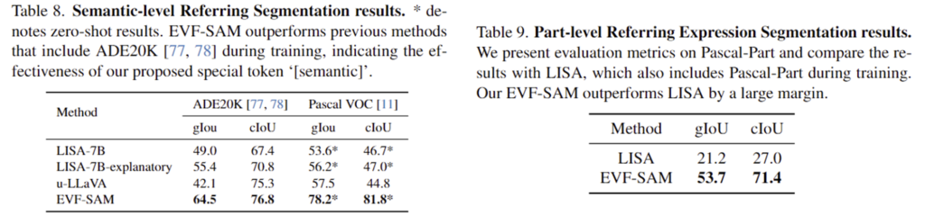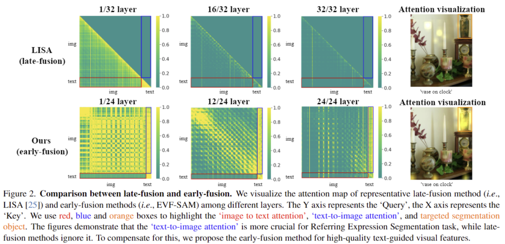 - EVF 프레임워크를 제안하여 다양한 실험 및 시각화를 통해 early-fusion 방식이 장점을 확인하고, 이를 기반으로 EVF-SAM을 제안