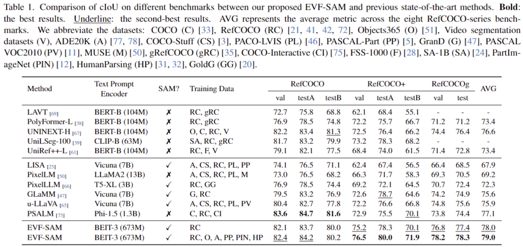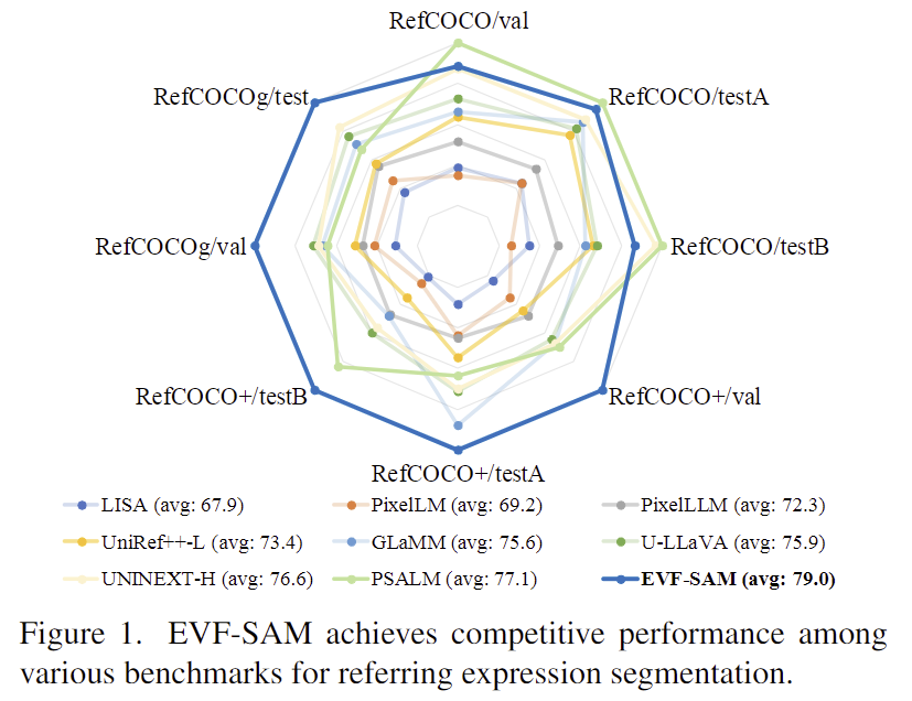 EVF-SAM은 기존의 foundation model을 기반으로 구축된 간단한 프레임워크로, 좋은 성능을 보이는 VLM 모델인 BEIT-3로 구성되어있으며, 간단한 방식을 제안하므로 다른 foundation 모델로의 확장이 용이하다는 장점이 있습니다. 또한, 위의 figure 1과같이, RES 분야에서 대체로 뛰어난 성능을 보이고 있습니다.