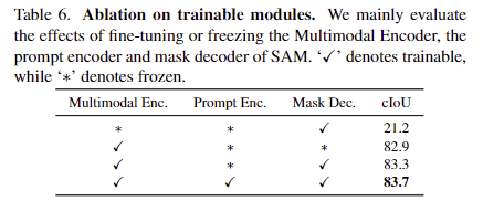 위의 Table 6은 3가지 모듈의 finetuning 여부에 대한 실험 결과입니다. 체크는 학습을 의미하는 것으로, SAM의 이미지 인코더는 freeze 되어있는 것이 가장 좋고, Multi-modal encoder를 fine-tuning할 경우 성능이 크게 개선됨을 통해 해당 모듈의 학습의 중요성을 확인하였습니다.