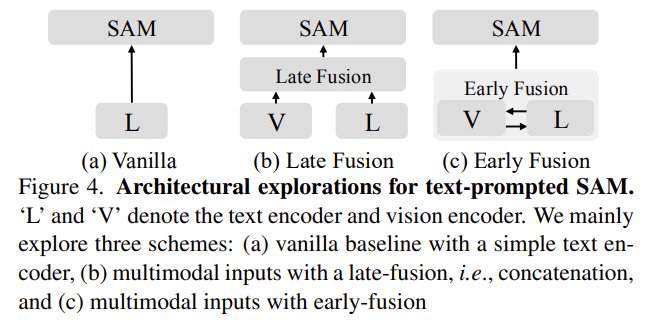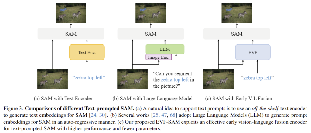 저자들은 이러한 문제를 해결하기 위해 (1) multi-modal 프롬프트가 text만을 이용하는 것 보다 성능이 우수하다는 것과, (2) text-to-image attention을 통합하는 early-fusion 방식이 더 좋은 성능을 보인다는 것을 제안합니다. 이를 기반으로 Early Vision-Language Fusion 인코더를 제안하고 이를 SAM에 적용하여 EVF-SAM을 제안합니다. (위에 있는 figure 3의 (c) 참고)