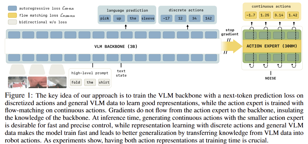 - Autoregressive와 flow-matching action prediction을 함께, 동시에 학습할 것. Autoregressive에 대한 학습은 학습 단계에서만 활용되기 때문에 빠른 추론 속도를 유지할 수 있음