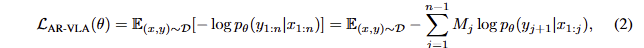 대부분의 VLAs는 large robot behavior cloning datsets으로 학습이 되어집니다. Autoregressive architectures를 가진 경우에서의 standard training은 negative log-likelihood를 최소화하는 방향으로 학습을 진행합니다. 이를 정리하면 아래와 같습니다.