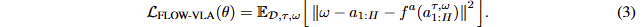 여기서 M은 loss mask로 예측해야 하는 token의 위치를 가르키는 것이며, D는 데이터 셋에 해당합니다. action을 예측하기 위한 flow-matching는 다음과 같은 loss로 구성됩니다.