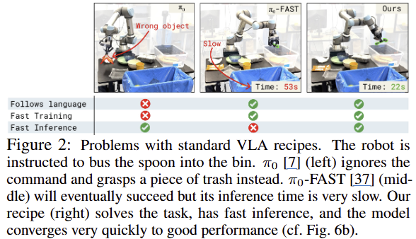 training. pi-zero나 GR00T N1과 같은 구조들은 빠른 추론 속도를 갖추기 위해서 robotics specifc modules를 포함합니다. pi-zero를 예를 들면 VLM에서는 1.3HZ를 보이는 반면에 action expert는 10HZ를 보입니다. 하지만 robotics-sepcific modules은 scratch로 초기화 되기 때문에 model의 language command를 따르는 능력에 영향을 미치는 문제가 존재합니다.