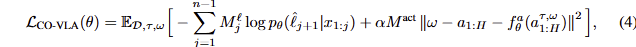 VLM data에 대한 공동 학습을 효율적으로 하기 위해서, 정책에 따른 언어 지시에 대한 지식 전이를 강화하기 위해서 그리고 빠른 학습을 위해서, 저자는 autoregressive language와 discrete action predictions, continuous actions의 flow-matching modeling을 한번에 공동 학습을 합니다. 이를 정리하면 수식 2와 수식 3을 결합한 loss에 해당하며 이는 다음과 같습니다.