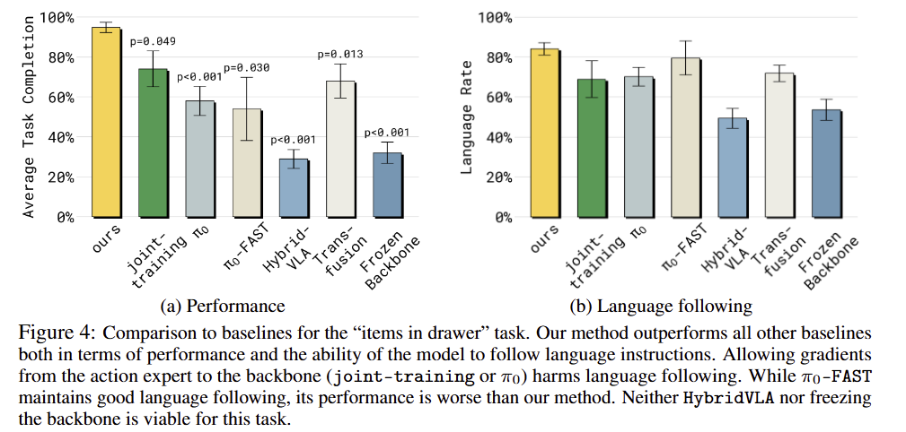 Fig 4-a를 보면 모든 기법들이 저자가 제안한 방법 대비 성능이 매우 떨어지는 결과를 보여주고 있습니다. fig 4-b에 따르면 stop gradient가 없는 pi-zero와 joint-training 같은 경우에는 거의 유사한 구조를 가지고 있지만 언어 지시를 따르는 데에 있어 저조한 결과를 보여주고 있습니다.