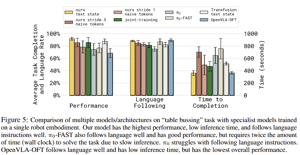 fig 5에서도 제시한 방법이 가장 좋은 결과를 보여주며, discrete token을 이용하는 FAST이 language following 성능이 비교적 높은 결과를 보여주지만, fig 5 오른쪽처럼 낮은 속도를 보여줍니다. OpenVLA-OFT 또한 language following에 대해서 좋은 결과를 보여주지만 performance가 가장 낮은 결과를 보여주고 있습니다.