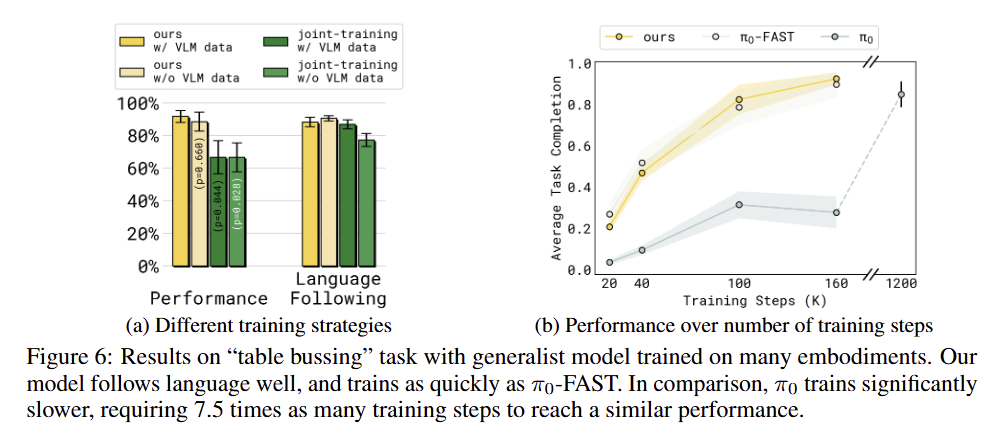 Convergence speed. fig 6-b에서 보이는 바와 같이 SG와 VLM data로 co-training을 활용한 경우에 pi-zero보다 훨씬 빠르게 수렴하는 결과를 보여주며, autoregressive model인 FAST보다 같은 step에서도 더 좋은 성능을 보여줌으로써, convergence에 긍정적인 효과를 줌을 증빙합니다.