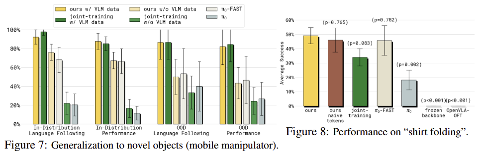 Transfer from VLM data into robotics. VLA의 숙원 중 non-robota data로부터 지식을 얻는 것이죠. fig 7은 서랍을 열어 물체를 옮기는 작업을 진행하는 task에 대한 평가로 여기서 옮기는 물체는 학습 중에 본적 없는 객체로 구성되어 있습니다. fig 7의 OOD Follow Rate에서 보이는 바와 같이 VLM data와 같이 학습한 joint-training w/ VLM data와 ours w/ VLM data가 가장 좋은 결과를 보여주는 것에 반해 다른 기법들은 저자한 결과를 보여줍니다.