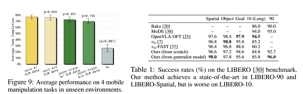 Fig 9에서 보이는 바와 같이 unseen 환경에서의 mobile manipulation task에서도 joint training을 사용한 경우에 좋은 성능을 보여주며, VLM data를 함께 사용한 경우에 더 좋은 결과를 보여주고 있습니다.