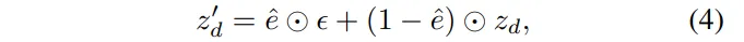 이렇게 difference map을 얻고 나면, 이제는 어디에 얼마나 노이즈를 넣을지 조절하는게 중요한 부분이 되겠죠. 입력이 앞서 metric depth라고 했는데 다만 이미지 레벨이 아니라 VAE 인코더를 토해 latent 공간으로 변환한 depth이 z_d가 들어갑니다. 수식적으로 보면 식(4)와 같은데요,