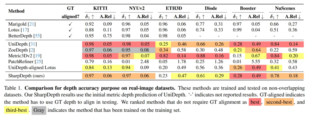 다만 ZoeDepth는 KITTI와 NYUv2 데이터셋으로 finetuning 된 모델이라 제로샷 모델에는 해당하지 않아서 제로샷 평가에서는 제외하였다고 하네요. 또한 추가적으로 Unidepth-aligned Lotus라는 비교 모델을 선정하였는데요, 이는 Lotus의 예측을 UniDepth의 값 범위로 scale과 shift를 해서 metric처럼 보이도록 만든 모델 입니다.
