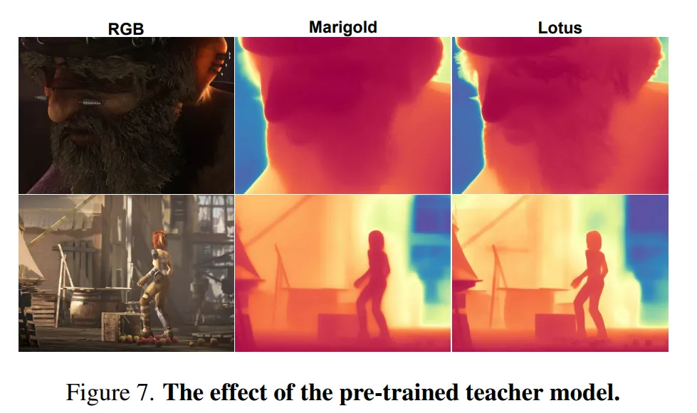 (F)가 depth 정확도가 조금 더 좋지만, (E)는 DBE completion metric에서 50이라는 큰 차이를 두고 높은 세부 정확도를 달성한 것을 알 수 있습니다. 이러한 결과를 통해 Marigold와 Lotus 중 Louts를 디폴트 teacher 모델로 선택하였다고 합니다.