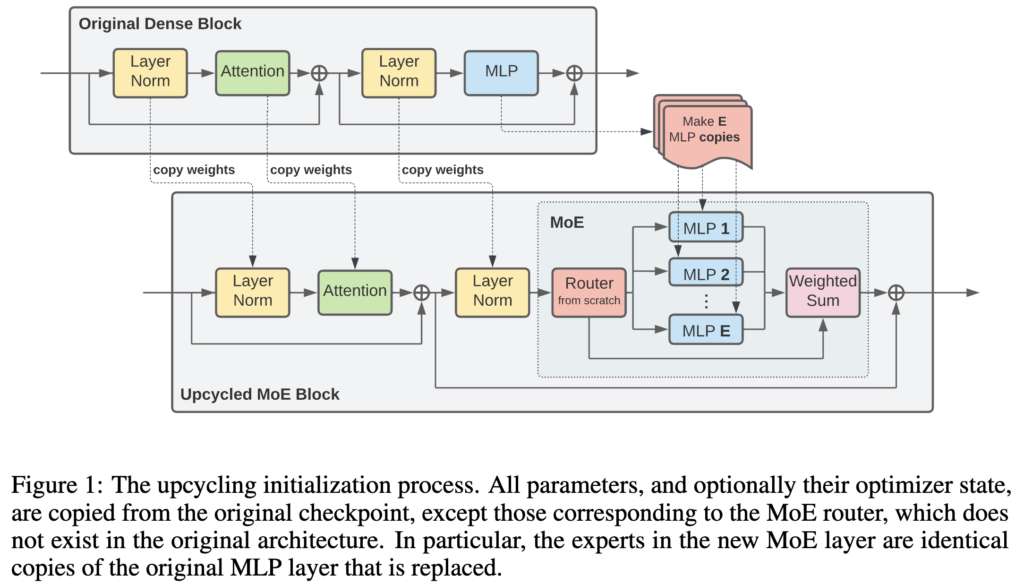 위 그림 1이 저자가 제안하는 알고리즘으로 매우 간단한 구조를 가지고 있습니다. 우선 학습된 dense 모델의 파라미터(체크포인트)가 필요합니다. 새로 만들 모델의 Transformer block의 수는 기존의 dense 모델과 일치하지만 MLP 부분에서만 차이가 있습니다. 여기서는 MLP 레이어를 E개의 MLP를 가진 MoE 계층으로 확장하고 MLP , layer-norm, attention, embedding, output layers의 파라미터는 원래 모델에서 그대로 복사해 사용합니다. 그리고 여기에 무작위로 초기화된 router를 추가해주면 새로운 upcycled model을 설계할 수 있습니다.