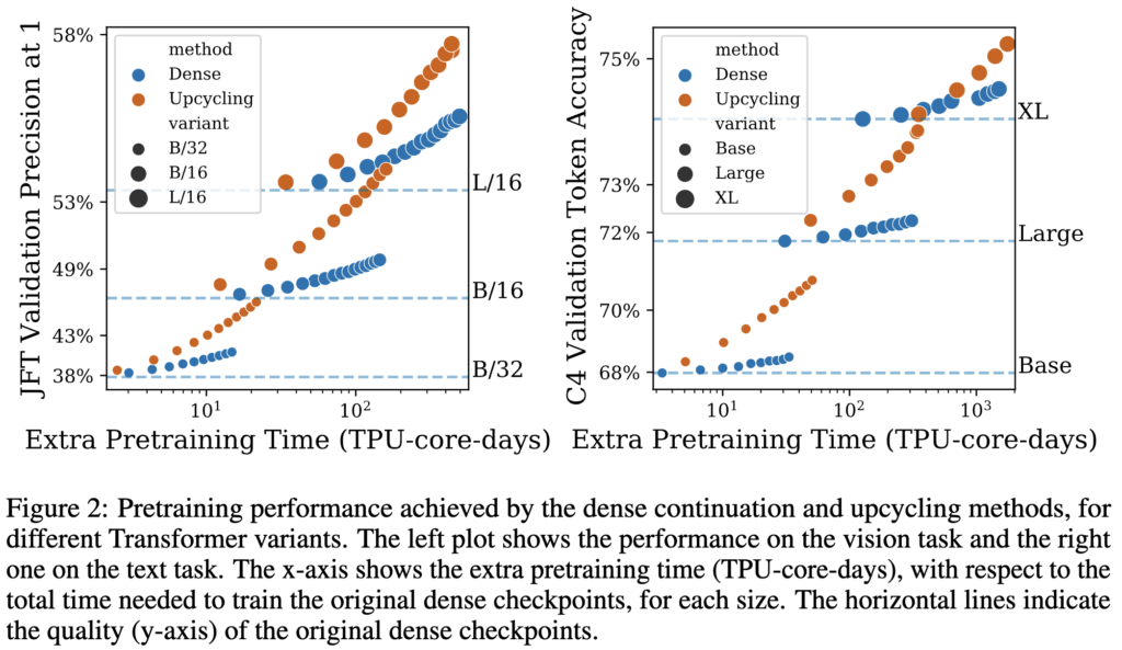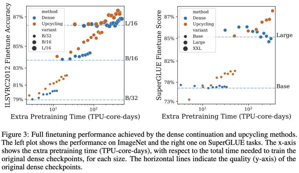 그림 2에서는 Vision(왼쪽)과 Language(오른쪽)에서, Upcycling 모델과 기존 dense 모델의 성능을 다양한 모델 크기에서 비교한 결과를 보여줍니다. 모델 크기나 태스크가 달라도, 추가 학습 cost가 아주 작을 때는 dense 모델과 Upcycling 모델 성능이 거의 같습니다. 하지만 추가 연산량을 학습을 이어가면, Upcycling한 모델이더 높은 성능을 내는 모습을 보입니다.
