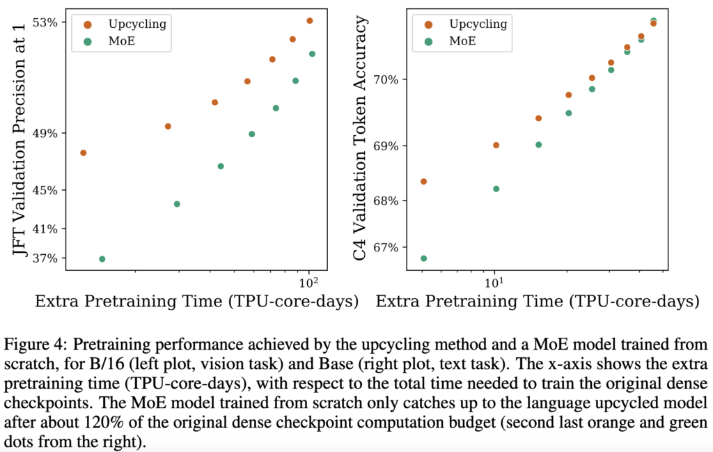 그림 4에서는, sparse Upcycling과 처음부터 sparse MoE 모델을 학습한 경우를 비교했습니다. 처음부터 sparse 모델을 학습하면 이미 학습된 dense 체크포인트의 연산비용을 재사용하지 못하므로, Upcycling 모델을 따라잡는데 더 긴 추가 학습 시간이 필요합니다. 특히 Language 모델의 경우, 처음부터 sparse로 학습하면 Upcycling 모델과 비슷한 성능에 도달하는 데 원래 dense 모델 연산량의 약 120%를 더 써야 합니다. 다만, 처음부터 sparse로 학습한 MoE 모델은 상대적으로 큰 학습률을 쓸 수 있고, Expert들이 처음부터 독립적으로 학습되고 다양화될 수 있기 때문에, 한 스텝당 성능 향상은 더 빠르게 나타날 수 있습니다. 그림 4의 결과로, 만약 아주 큰 연산 자원을 쓸 수 있다면, 처음부터 sparse 모델을 학습하는 게 결국엔 Upcycling 모델을 따라잡을 수 있다는 걸 보여줍니다. 하지만 연산 자원이 제한되거나 충분하지 않을 때에는, sparse Upcycling이 훨씬 더 효율적인 접근법이 될 수 있습니다.