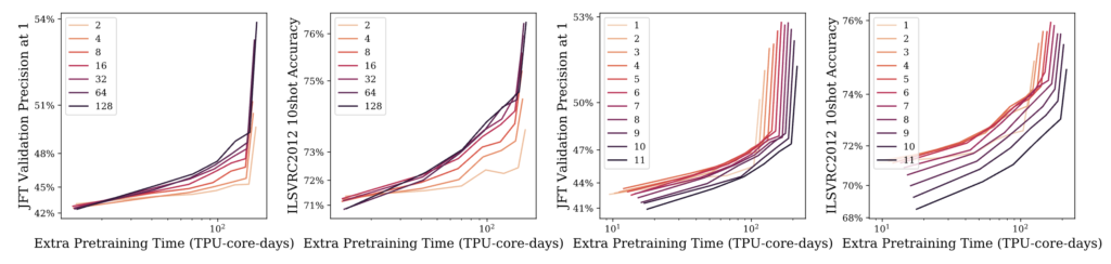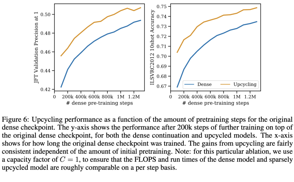 Upcycling 효율성은 원래 dense 모델이 얼마나 잘 수렴했는지에 따라 달라질 수 있습니다. 이를 알아보기 위해, 그림 6에서는 dense 체크포인트의 사전학습 정도가 서로 다른 상태에서 B/16 비전 모델을 Upcycling했습니다. 같은 dense 체크포인트에서 출발해, Upcycling과 dense continuation을 각각 20만 스텝씩 추가 학습시켜 성능을 비교한 결고어느 단계에서 Upcycling을 시작하든, Upcycling으로 인한 성능 향상 폭은 일관되게 나타났습니다.