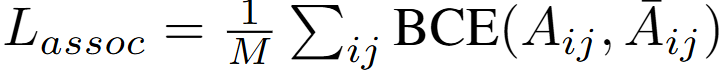 이 특징 집합인 X를 입력을 받아 모델은 global association matrix P \in \mathbb{R}^{N \times N}를 예측합니다. 프레임 내 객체 수를 N_t라고 한다면, X의 총 특징 개수 N=\sum_tN_t입니다. 이 특징 집합을 입력 받아 모델이 P를 예측하게 되는데 P의 구성요소인 P_{ij}는 객체 i와 j가 같은 객체의 궤적일 확률을 의미합니다. 위 그림에서 association matrix에서 색이 진한 구간이 i와 j가 같은 궤적임을 의미하는 것입니다. P는 sigmoid 연산을 거친 출력으로 트랜스포머 기반의 예측 모듈입니다. 2개의 self-attention을 통해 구하게 됩니다. 동일 궤적이라면 1, 아니라면 0으로 학습하며 GT 궤적의 일치여부는 IoU가 0.5 이상인 경우를 말합니다. 이후 이진 크로스 엔트로피를 통해 학습되며 손실은 아래와 같습니다.