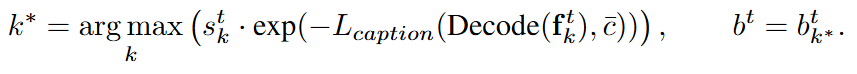 저자가 추가적인 학습 없이 Video Grounding에서도 SOTA를 달성했다고 언급했었는데, 출력 기반의 간접 접근을 통해 예측을 수행합니다. 모델이 예측한 각 객체 궤적에 대해 주어진 문장 Q를 생성할 확률 P(Q|trajectory)를 계산하고, Q의 likelihood를 계산하여 score를 곱하는 것으로 예측을 수행합니다. 수식은 아래와 같습니다.