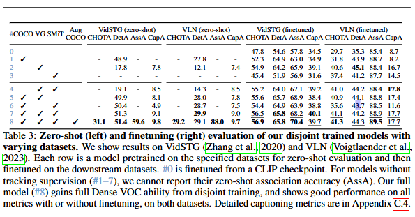 표3는 저자가 제안하는 모델을 VidSTG와 VLN 검증셋에서 평가한 성능입니다. #8이 저자가 제안하는 최종모델의 성능입니다. 먼저, zeroshot에서 COCO로 학습하면 검출 성능이 높지만, Caption 성능이 없고, VG로 학습하면 캡션 능력은 생기지만, 도메인 차이로 인해 검출 성능이 떨어지게됩니다. 하지만, SMiT를 추가로 결합하면 비디오 문장 생성 능력을 추가하기 때문에 성능이 많이 개선되고 마지막으로 Aug-COCO을 추가하는 것으로 성능이 한단계 더 상승되어 최종 모델의 성능을 얻을 수 있습니다. Finetuning을 하면 당연하지만 성능이 개선됩니다. #0 CLIP에서 finetuning을 한 것보다는 약 10퍼센트 가량의 성능 개선을 보이며 저자의 방법이 효과적임을 보이고 있습니다. 다양한 데이터셋으로 disjoint 학습을 하는 것이 효율적임을 보여주는 실험결과입니다.