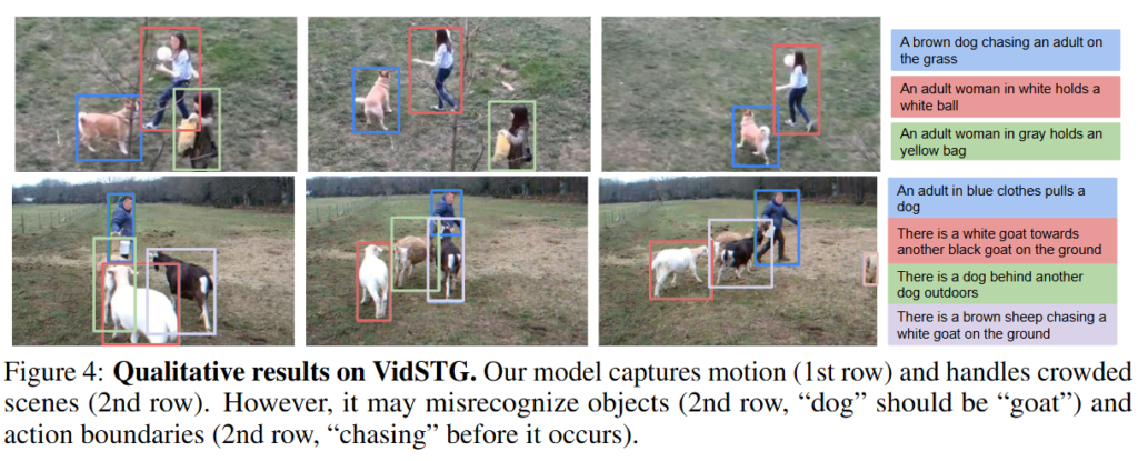 마지막으로 정성적 결과입니다. 비디오 내에 존재하는 객체를 검출하고 객체의 궤적을 추적할 수 있으며 동시에 객체의 행동에 대한 캡션을 생성합니다. 정성적 결과에서 확인할 수 있듯이 하나의 객체 궤적에 대해 하나의 캡션을 생성하기에 동일한 객체가 여러 행동을 하더라도 따로 묘사할 수는 없다는 단점이 존재합니다. 또한, 저자는 200프레임이 넘어가는 긴 영상에 대해서는 대응이 어렵다고 한계점을 말하고 있습니다. 이는 추후에 시간축을 늘리거나 메모리 효율적 구조를 도입함으로 개선할 예정이라고합니다.